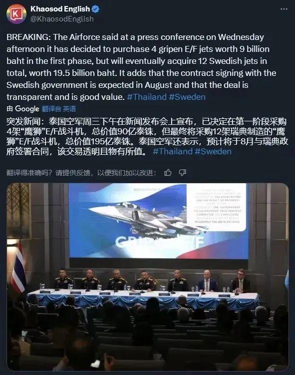 泰国皇家空军在6月6日宣布,泰国正式确定将从瑞典采购JAS-39E/F型“鹰狮”战斗机,作为泰国皇家空军的未来新型多用途战斗机。泰国宣称该项目的正式合同将在今年8月份与瑞典正式签署,并且称“这项武器采购公开透明、物有所值”。